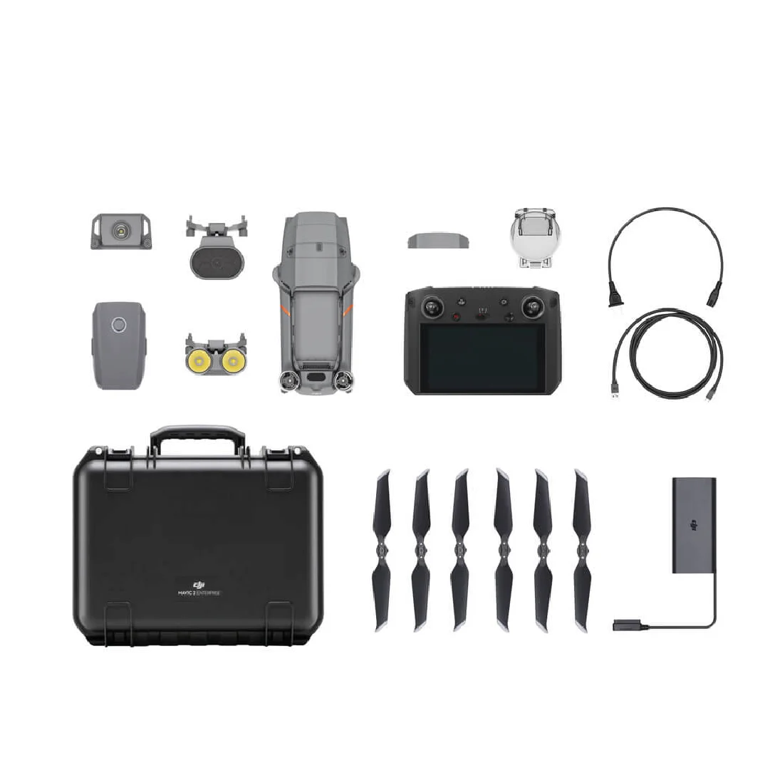 El Kit Mavic 2 Enterprise Vuela Más incluye dos Baterías de Vuelo Inteligente autocalentables, un cargador para el coche Mavic 2, un puerto de carga de baterías, un adaptador de batería para batería externa, unas hélices silenciosas y una bandolera Mavic 2.